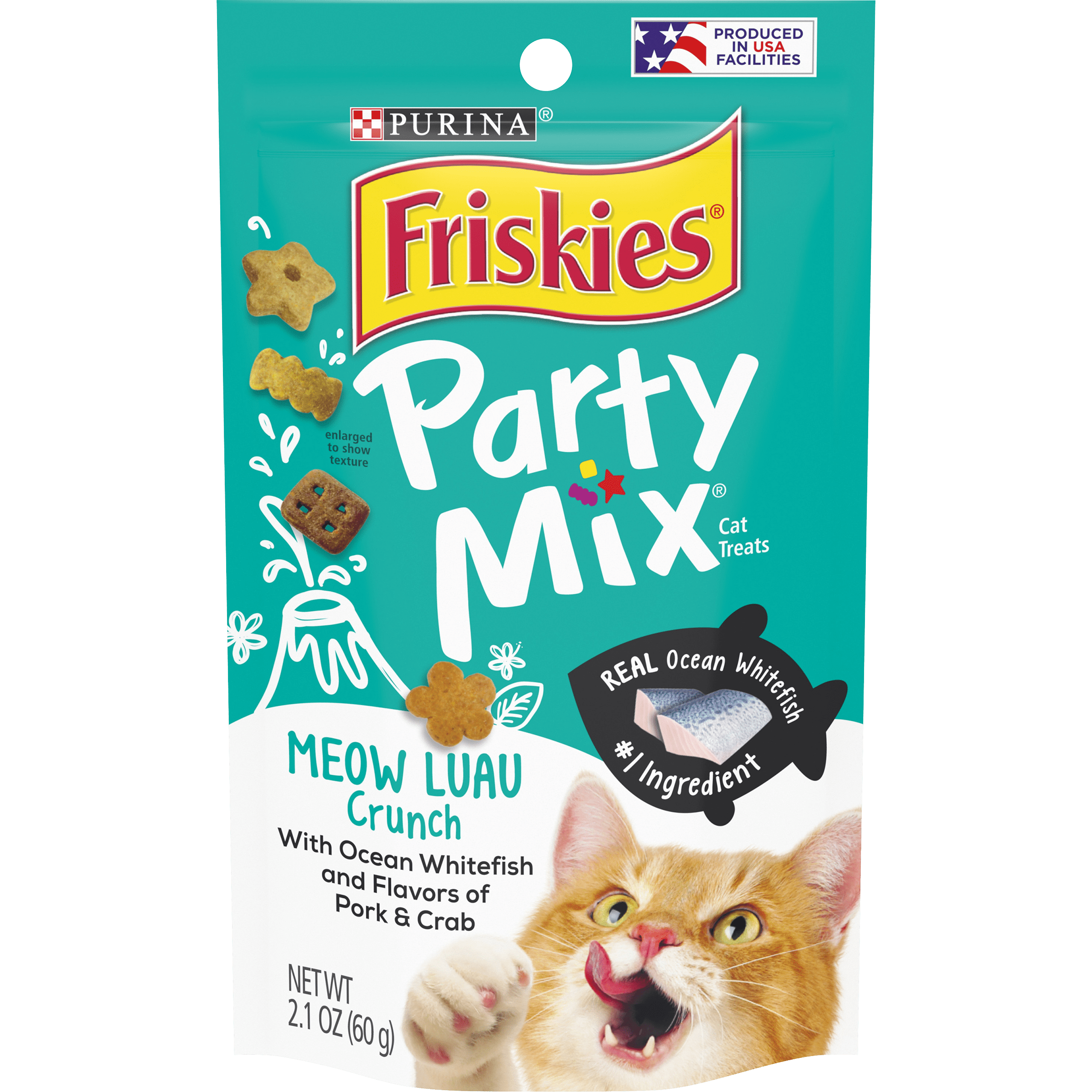 . Purina Friskies Party Mix Original Crunch provides 100 complete and balanced nutrition for adult cats so that it will not dilute the nutritional value of your cats regular maintenance diet. For more information tips and advice from Purina experts click here. Yum-filled yum-grilled Friskies canned cat food features delicious stufd bites paired with tender meaty pieces.